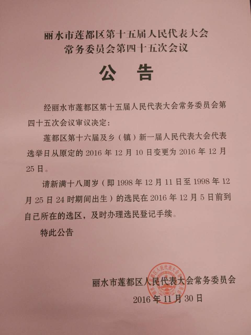 蓮都區(qū)人大常委會關(guān)于變更選舉日期的公告