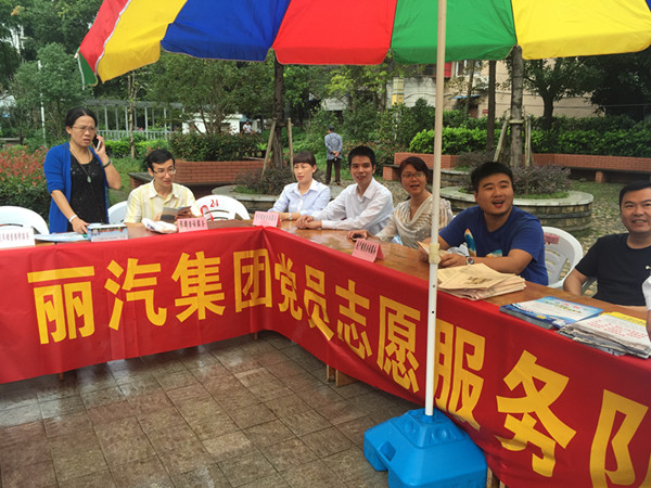 活動(dòng)當(dāng)天,麗汽集團(tuán)的黨員們一早就來到燈塔公園,面向廣大群眾展開了汽車班車時(shí)刻咨詢、汽車銷售維修、汽駕培訓(xùn)咨詢、旅游咨詢、房產(chǎn)銷售咨詢等多項(xiàng)服務(wù)。雖然天空中飄著雨,但黨員同志和社區(qū)群眾的熱情不減,短短半天時(shí)間,黨員們共向到場群眾發(fā)放宣傳冊(cè)頁及資料2000份,解答咨詢60人次,贈(zèng)送雨傘200余把,紙巾100盒,環(huán)保袋500只,惠及群眾800人次。
