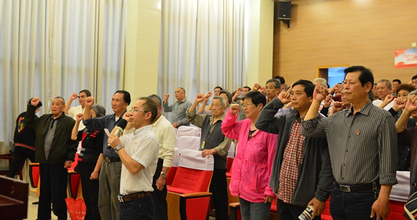 展廳參觀完畢,老黨員們移步到觀影廳,對(duì)著黨旗,大家重溫了入黨誓詞。仔細(xì)聆聽(tīng)了離退休黨總支副書記張國(guó)軍向大家傳達(dá)的《董事會(huì)工作報(bào)告》。隨后,大家觀看了《烽火浙西南》影片。