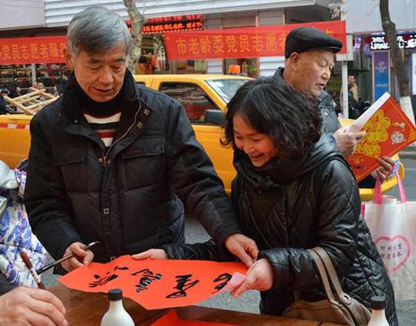 幾張小桌子拼成的簡(jiǎn)易書案更是黨員一條街上靚麗的風(fēng)景。三位老同志一落筆,書案旁邊一下子就圍滿了人,大家一邊排隊(duì)等候著“墨寶”,一邊點(diǎn)贊著三位老師的書法。葉女士高興地說:“手寫的春聯(lián)不僅更有年味,而且還是在弘揚(yáng)中國(guó)的書法藝術(shù)。中國(guó)傳統(tǒng)的年俗文化,現(xiàn)在已經(jīng)越來越難得了。”一對(duì)雙胞胎寶寶的父母恰巧推著嬰兒車從服務(wù)點(diǎn)前經(jīng)過,趕緊請(qǐng)老師寫下“開心寶貝”四個(gè)字,還說是給孩子倆最珍貴的新年禮物。