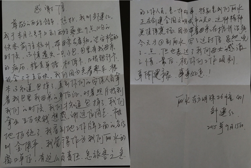盡快送回“救命錢”,對(duì)金偉平來說,是做好本職工作,但對(duì)鄒女士母女來說,卻也猶如雪中送炭,正如鄒女士在信中寫道,“作為我們麗水的窗口單位(客運(yùn)西站),有這樣負(fù)責(zé)任,急旅客之急的工作人員,是一件好事,特別是我們麗水正在創(chuàng)建全國(guó)文明城市的關(guān)口,這種精神更值得表?yè)P(yáng)?!?/p>