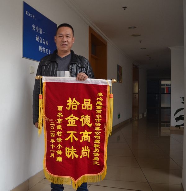 “拾金不昧,本不是新聞了,但輪到自己親身體驗(yàn)這種社會(huì)正能量的日益增長(zhǎng),還是讓我倍感欣喜?!?0月16日傍晚,在江蘇開超市的徐先生手拿錦旗,來(lái)到快客分公司車隊(duì),對(duì)駕駛員湯勇文拾金不昧的精神予以表?yè)P(yáng)。他說(shuō),11月14日他乘坐18:45從杭州回麗水的班車,一時(shí)大意把隨身的錢包遺失了,里面有五千多元的現(xiàn)金和若干張銀行卡。次日,當(dāng)他焦急萬(wàn)分來(lái)到快客車隊(duì)時(shí),卻發(fā)現(xiàn)駕駛員湯勇文正拿著妥善保管的皮夾等著他?!?br/> 據(jù)了解,當(dāng)天晚上11時(shí)左右,駕駛員湯勇文在做下客后的檢查時(shí),發(fā)現(xiàn)一只皮夾被旅客遺落在車廂通道上,他打開皮夾一看,足有好幾千元的現(xiàn)金和各類卡,他心想,這么重要的東西旅客一定會(huì)再回來(lái)找的,他把情況向值班隊(duì)長(zhǎng)報(bào)告后,又在下客區(qū)足足等了十余分鐘,也不見(jiàn)旅客回來(lái)找。于是,他將皮夾保管完好等著歸還旅客,也就有了開頭一幕。